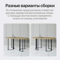 Подстолье, состоящее из двух ножек-полумесяцев, изготовлено из металла (высококачественная сталь) с устойчивой (двойной) порошковой окраской. Столешница выполнена из ЛДСП высокого качества Egger. Толщина столешницы - 25 мм.