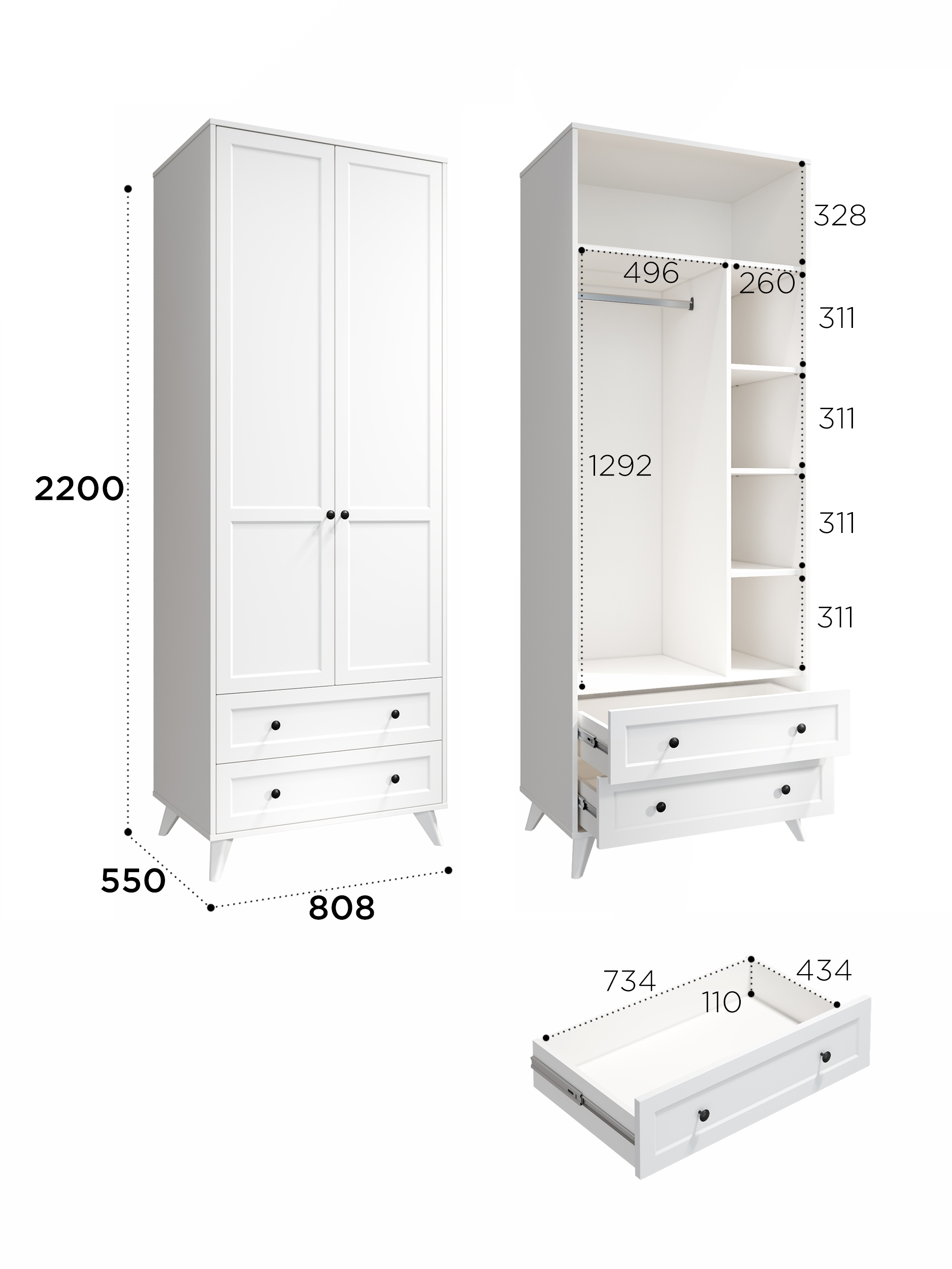 2 выдвижных ящика на телескопических направляющих полного выдвижения