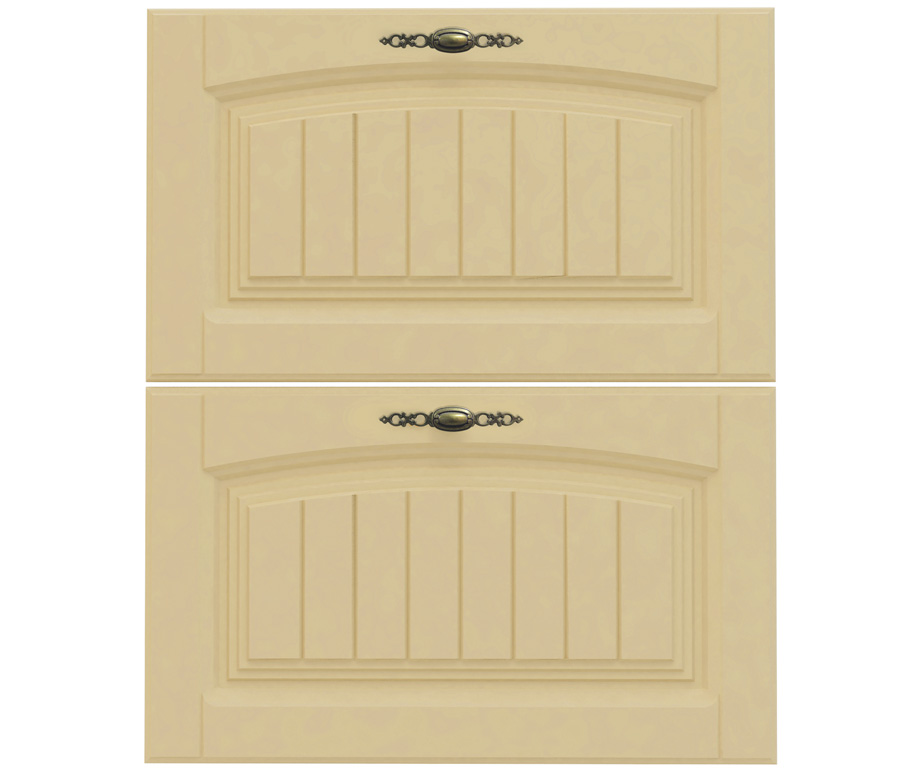 Две панели с ручками для ящиков шкафа. Они предназначены для классического кухонного шкафа с двумя ящиками. Можно выбрать панели бежевого цвета или оттенка «дуб Ривер» и «вишня Барселона» и «бежевый».